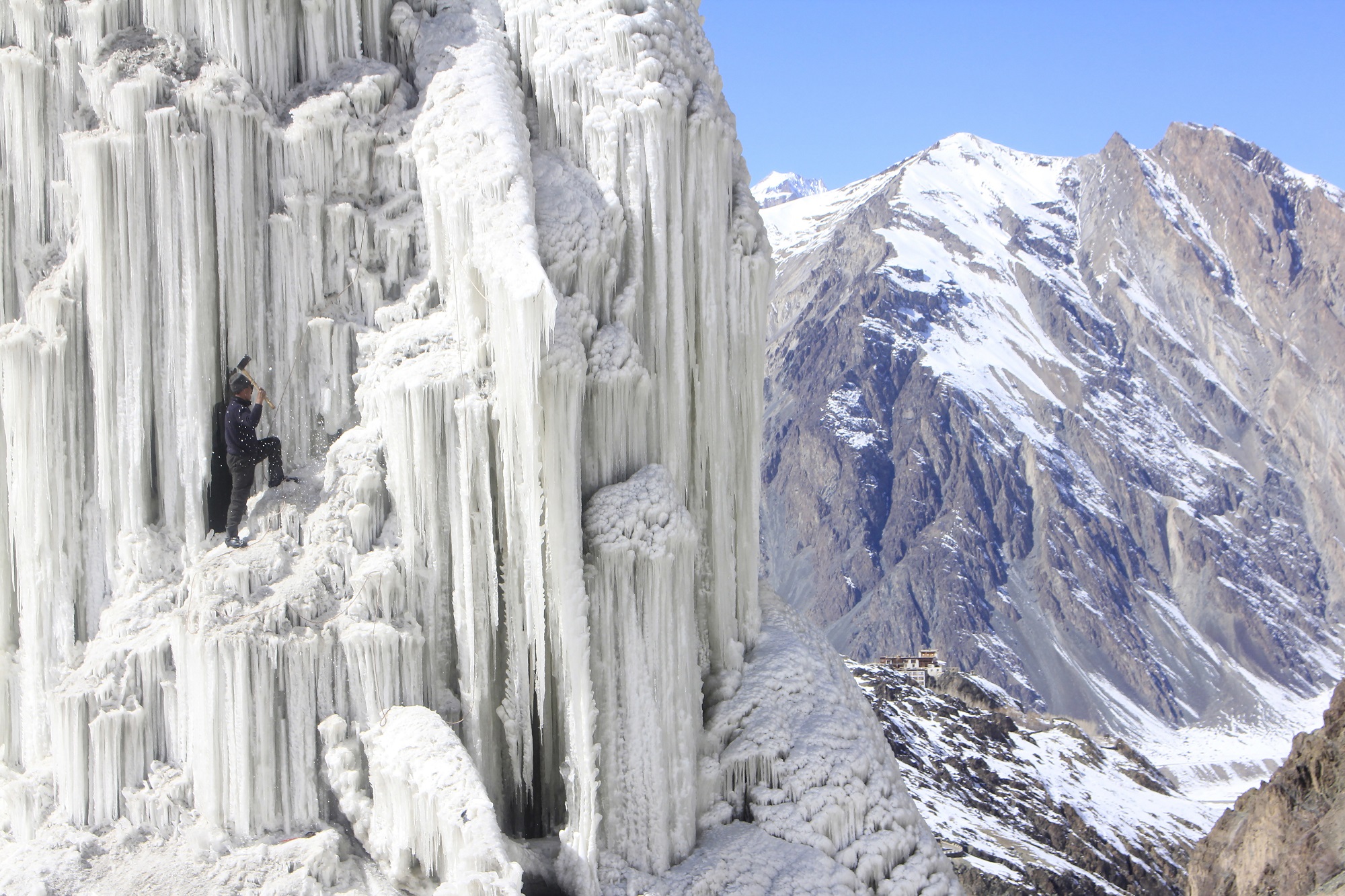 Sullo sfondo di questa quotidianità, coloro che vengono chiamati in lingua locale “Rgon mai”, costruiscono, con tecniche tradizionali e pratiche moderne, un ghiacciaio artificiale, una cattedrale che alimenterà l’agricoltura e garantirà un’almeno temporanea sopravvivenza. Un girotondo di voci ed esistenze in una danza attorno all’acqua.